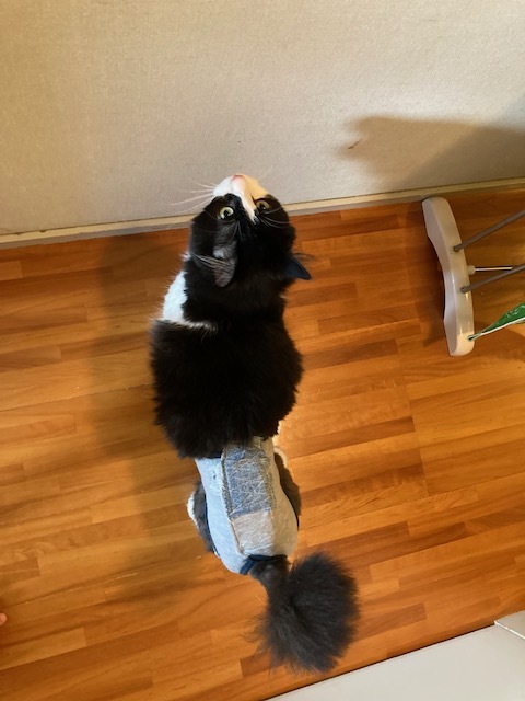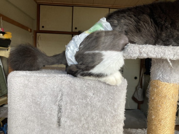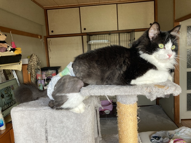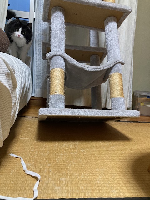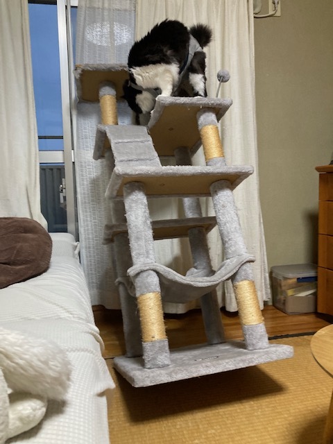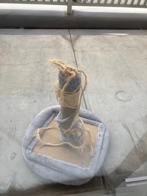 キャットタワーの上の部分は、ちょっと前に、ハチにぶっ壊されて、修正不可能でベランダで