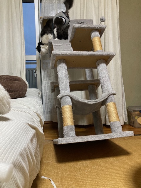 この手のキャットタワーが倒れるとか、ありえへんと思うねんけどなぁ。