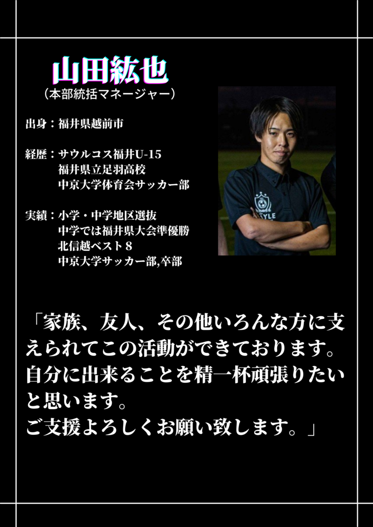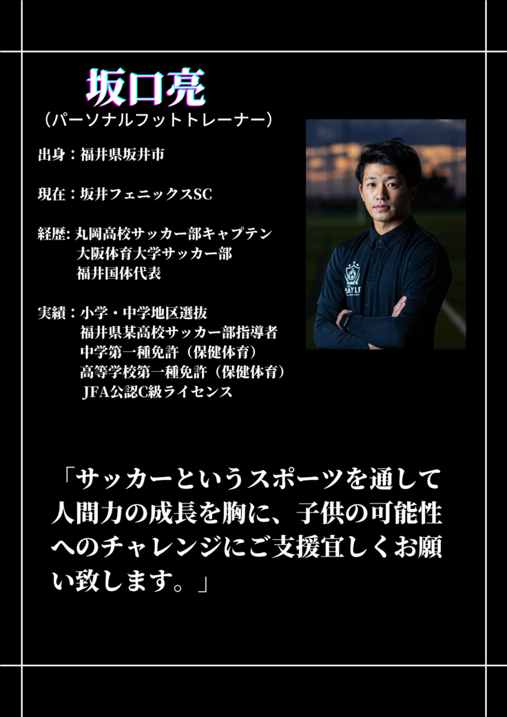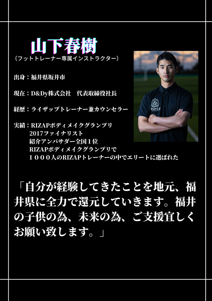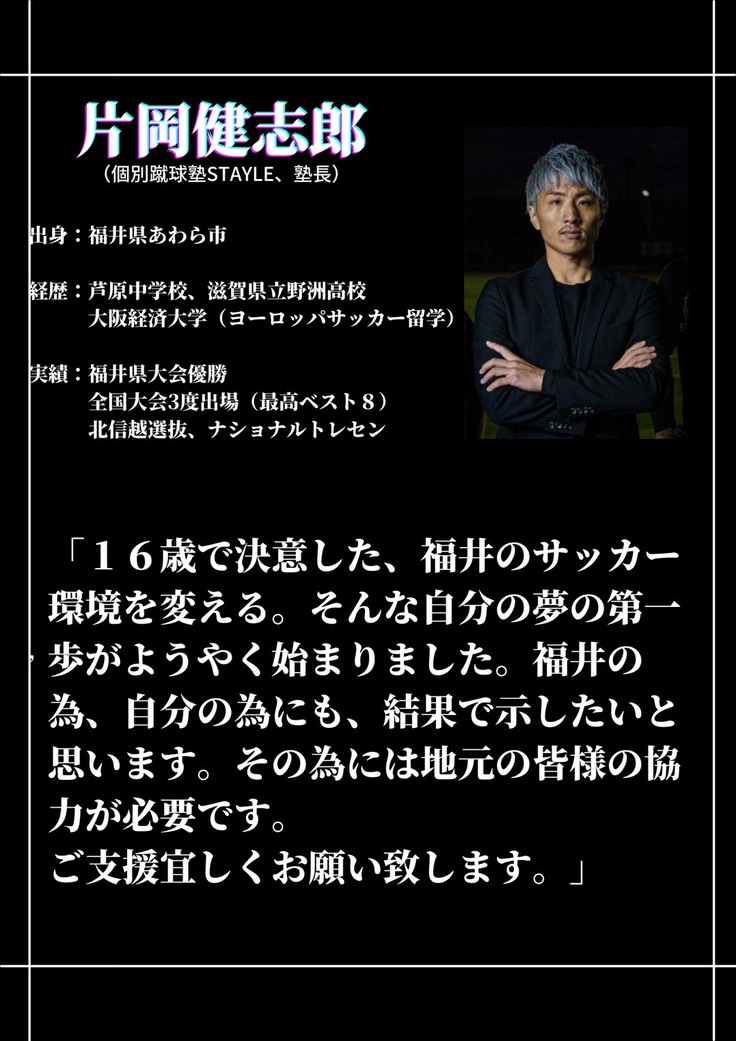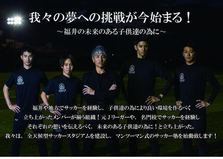「福井のサッカーは九州のサッカーの30年遅れている」と言われたことがあります。現状を見ても、とてもじゃないですがプロサッカー選手になれる環境は整っているとは言えません。 一人一人が協力しあい、小さなことを積み上げていくことで子供達の明るい未来に繋がってくと我々は考えております。