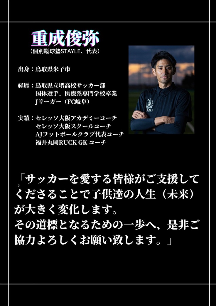 今回のクラウドファンディングの支援金は、 個別蹴球塾STAYLE専用の練習場「STYALE Studeim」の建設費用を一部に充てさせて頂きます。ご支援、応援のほど、よろしくお願い致します。