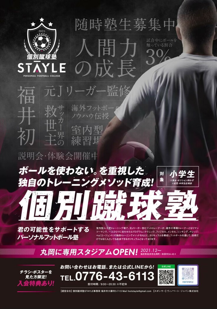 STAYLE -MAN to FOOTBALL-とは? 福井丸岡にある屋内型人工芝ピッチ完備のスタジアム内で行うマンツーマン式サッカースクール!選手1人1人を技術・体力・試合を徹底的に分析して独自プログラムで、独自指導を受けたマンツートレーナーが、スタジアム内の複合型施設にて1対1で指導を行います!選手に合わせた複数のプランと、遠方や県外の為の合宿やオンラインプランも用意してます。