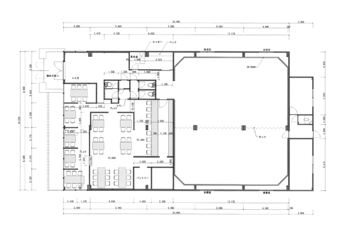 約60坪の全天候型の人工芝トレーニング場となっており、天候に左右されずに快適にレッスンが行えます。世界受賞実績のある人工芝『Easy Glass』を敷き、子供達にトレーニングを行ってもらいます