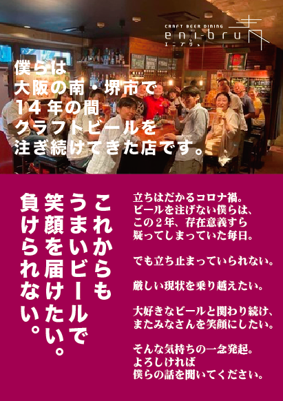 株式会社喜色満面堂クラフトビアダイニングエニブリュは、ビールを主体にした夜型飲食店ゆえにコロナの影響で休業、時短にずっと苦しんでおりました。 このまま沈みゆく船のようではいけない。しかもいつまたこの苦しい状況がくるかもしれない中、急いで打つべき方策を考えなくては...。 そこで一念発起し、14年間続けてきたクラフトビールバーを改装リニューアルし、コロナ禍でもビールの灯火を消さず、酒類提供が難しくても運営していける「飲食店+酒販店+物販店」への業態転換を致します。あらゆる場面でビール文化を発信する新しい形の複合業態です。 皆様からお預かりする支援金は、100万円が集まった場合、店舗の一部を取り壊し廃棄し、新たに改装する費用・ビアセラー用の大型冷蔵ショウケース、量り売り用製缶機、展示用の造作など設備備品の購入費として大切に活用させて頂きます。 もし、100万円に満たなかった場合は支援金は店舗の人件費や運営費に充当させていただきます。