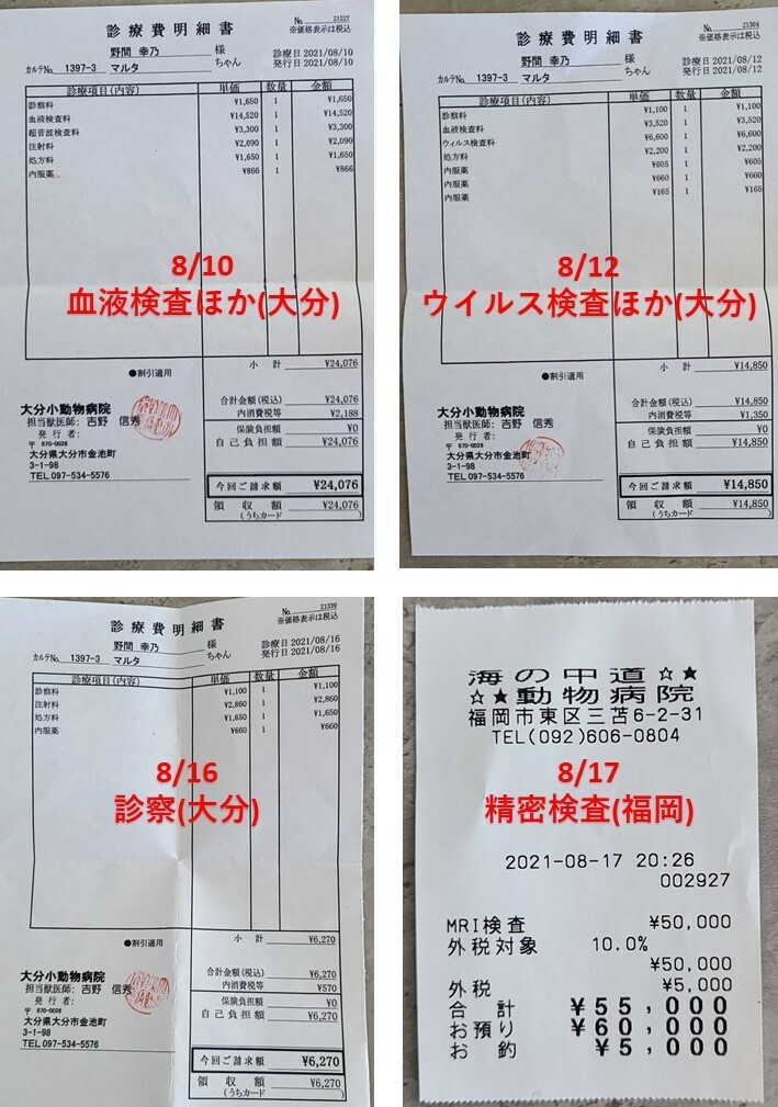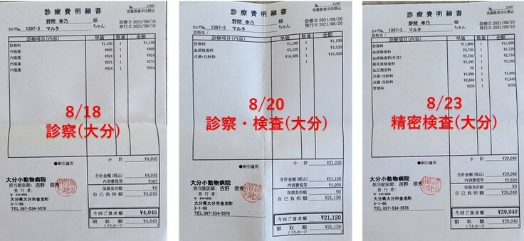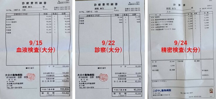 ▲寝たきりになったマルタと心配するトロ ▲検査・診察代の明細