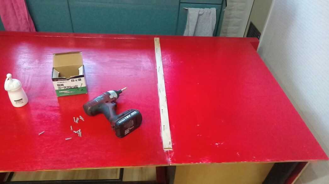 キッチンのカウンターの側板、900x2400のサイズのため、既製品のコンパネをつないで使用するのだけど、棚板の幅の関係でちょうどよい位置に柱が来ないため、5ミリと3ミリの板を重ねてボンドで接着して継ぐことにした。固まるまでプレスで押さえておければよいのだけど、素人なのでそういう工具がないため、木ねじで固定して一晩おくことにした。荷重はかからないので、これでうまくいくと思う。うまくいって欲しい。うまくいけよ。