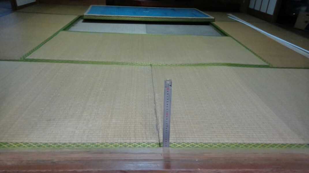 畳の厚さは55ミリ。スタイロフォームが芯の、いわゆるスタイロ畳だ。廃棄するときに芯材を回収して、断熱材に使えるな。垂木のサイズを55ミリ増やせば面一にできるけど、敷居を撤去してバリアフリーにするなら、敷居の高さ25ミリを引いて30ミリのかさ上げか。フロアにはカーペットタイルを敷いて使いたいので、5ミリ引くと25ミリ。これなら、25ミリの厚さの板をこの上に敷いたほうが、荷重が分散されるしいいな。あるいは、12ミリのコンパネを敷き方を変えて二重にしたほうがもっといいかも。それだと16枚。今は高騰して2千円くらいだから、32000円でフロアが張れる。タイルカーペットは、アトリエの時の業者に注文して、半端柄のアソートなら格安だな。
