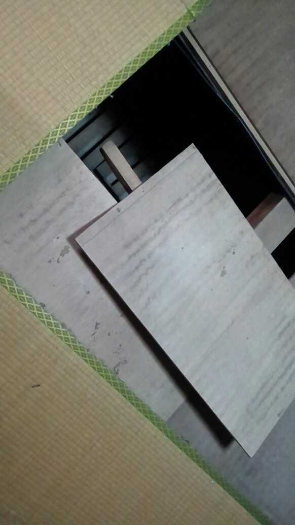 洋間に改装する和室の構造だけチェックしてみた。ものさしを畳の隙間に差し込んでごしごしして畳をあげる。こどものころに畳屋さんがやってたことの真似だ。畳の下は、古い家なんかは杉板が並んでいるのだけど、この家はコンパネだった。鉄骨なので、鉄骨の上に大引きが渡されていて、それにクロスして垂木だっけ、そこそこの数が渡され、その上にコンパネが張られていた。一か所ぼこぼこしていたとこは、小さい板が脱線して乗り上げていたことが分かった。釘が効かなくなっていた。