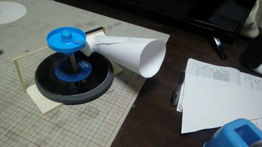 早めに店に戻って店番。夕食後、すっきりした作業部屋で蓄音機のホーンのサイズなどを試作してみる。ターンテーブルは、手動部分をペーパークラフトで作って一体化するほうがいいな。頂上をカットした円錐形にする。センターをきちんと出したいので、イラレで設計して350kgケント紙で出力、滑り止めのシートを載せた段ボールの円盤を回すことにする。針は、持ち手の平たい待ち針を接着する。