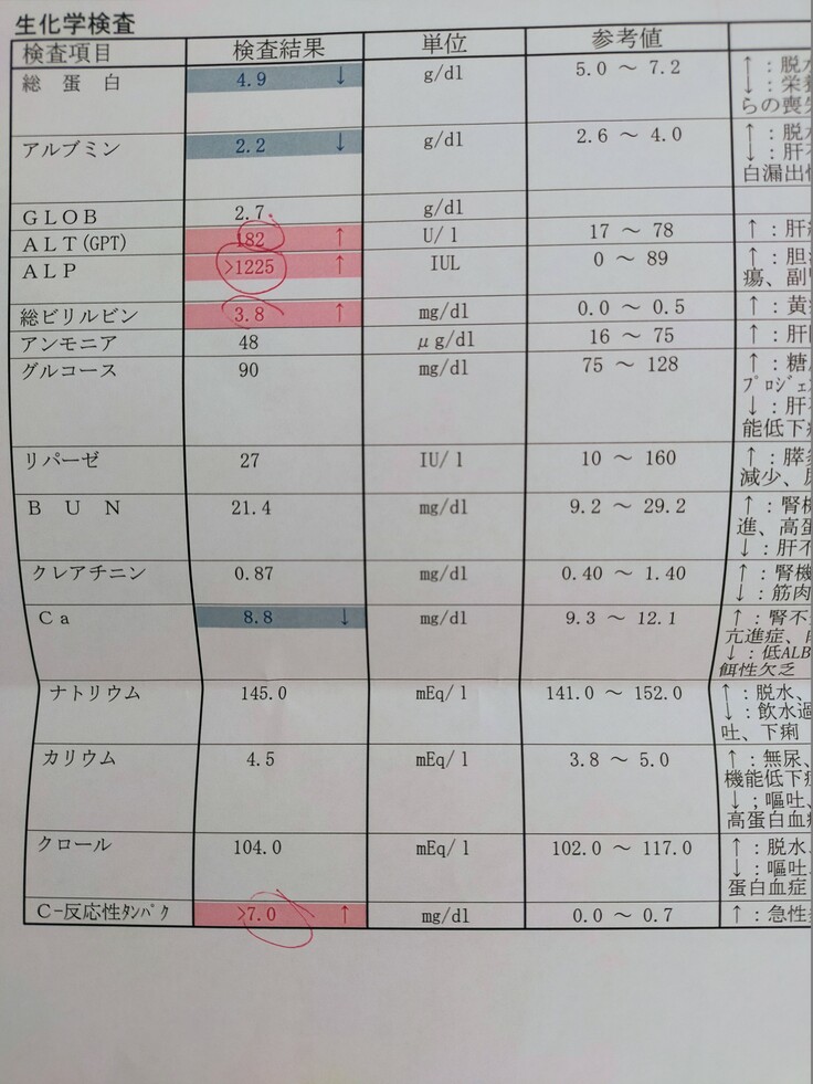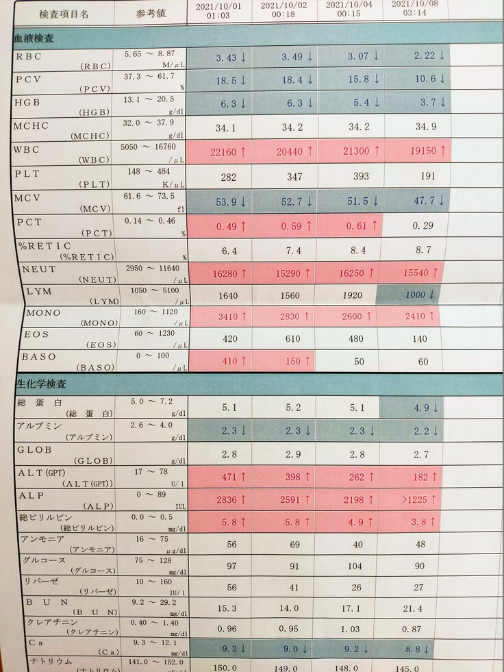 ・血液検査(極度の貧血と計測不可能な黄疸数値)