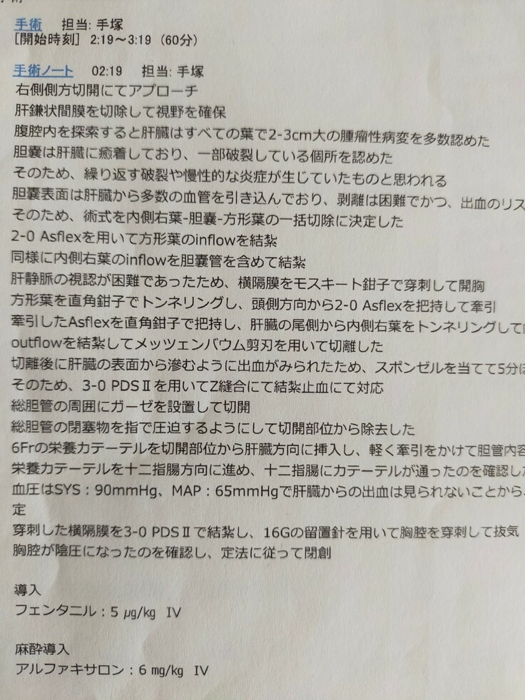 ・緊急手術(破裂した胆嚢と肝臓の一部を摘出)