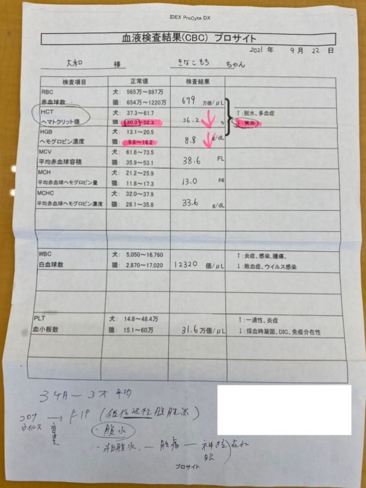 内臓の数値は正常なのに対してFIP特有のA/G値がかなり下がっていること、