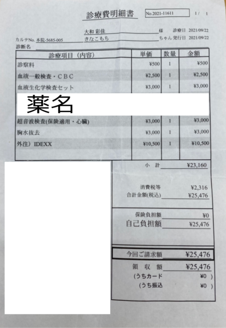約100ccの胸水を抜き点滴をしてもらい、利尿剤と食欲増進剤を処方してもらいました。