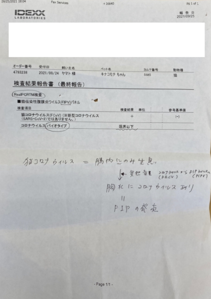 陽性(+)猫伝染性腹膜炎(FIP)だと診断されました。