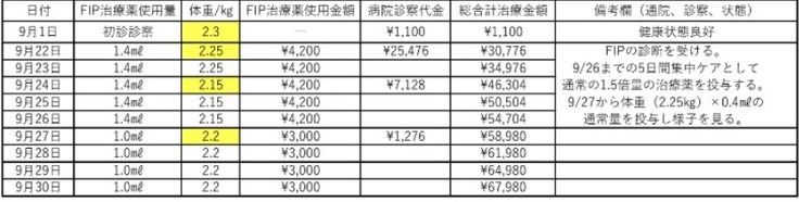 きなこもちの体重に対しての一日の薬剤の使用量金額