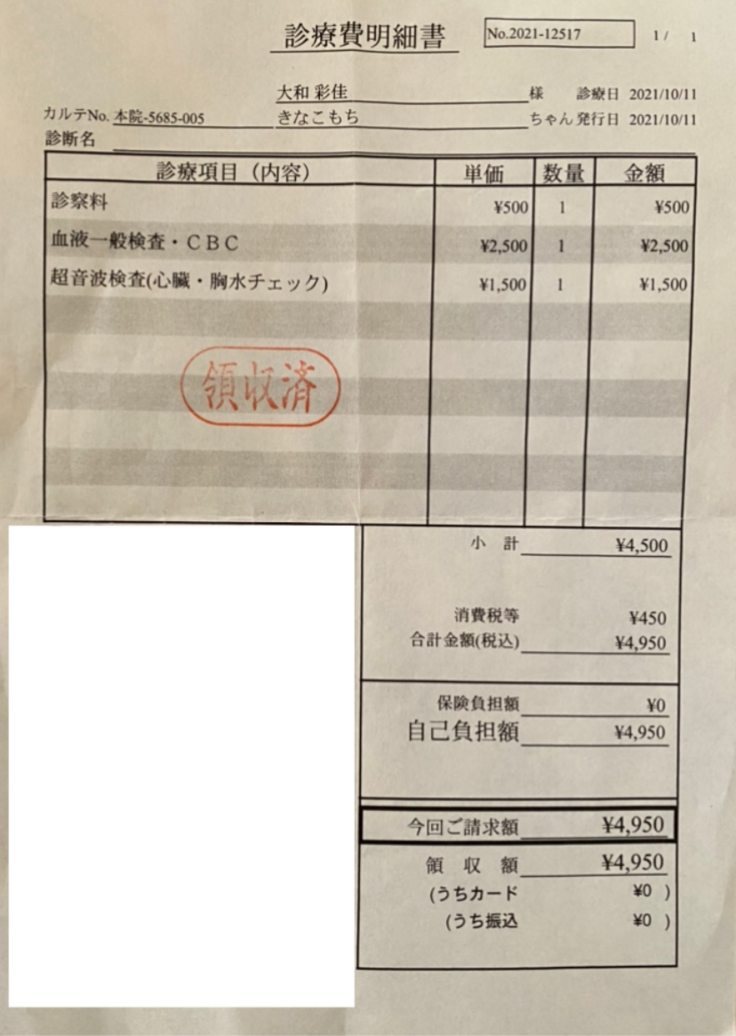 10月11日現在に至るまでにかかった治療費¥113,150は今後の経過観察による検査費用も含めまして、最低でも50万程度は必要になると想定しております。