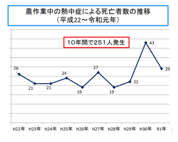 過去10年間で、農作業中に熱中症で亡くなった人は250人を超えます。