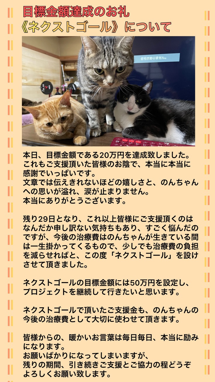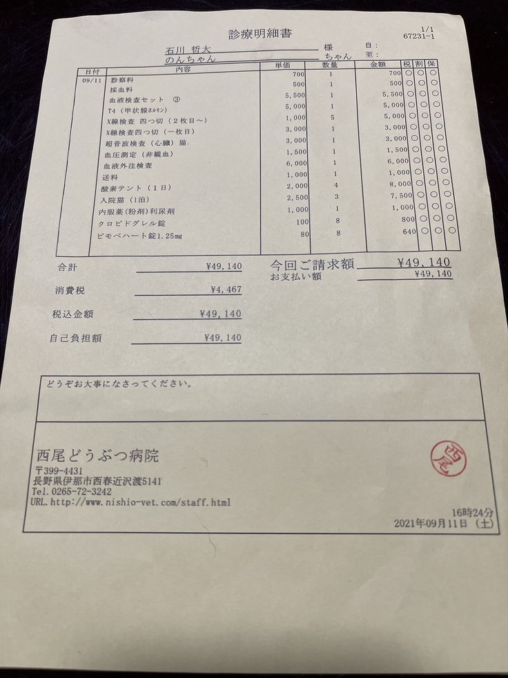 ・心臓病のキャットフード・缶詰 / 3ヶ月 ¥16000 ・通院代 / 3ヶ月 ¥10000 ・定期的な検査代 / 3ヶ月 ¥50000 ・毎日の薬代(4種類) / 3ヶ月 ¥20000 ・酸素室のレンタル代 / 3ヶ月 ¥60000 ・READYFOR手数料12% ¥24000 ・消費税10% ¥20000 合計 ¥200000