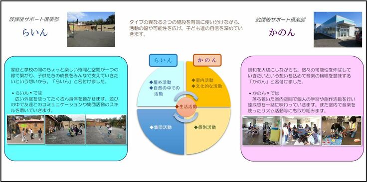 小さな川に隣接した静かな環境にあり、利用している子ども達は、すぐ近くの支援学校の生徒達で、「外遊びによる集団活動の”らいん”」と「個別支援による創作活動の”かのん”」の2タイプの施設で活動を行っています。
