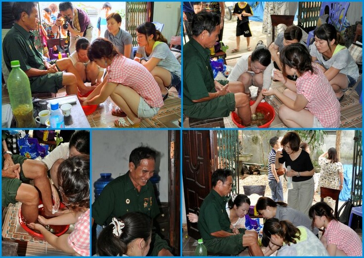 奨学金贈呈の他に、貧困家庭への生活支援として、家庭の事情に合わせて、お米、水牛、子豚、精米機なども贈呈してきました。水牛は農耕使役に役立て、子豚は飼育して子を増やすことで家庭の収入源になるように。精米機は、働きに出られない障害者の家族に贈呈し、彼らがそれを地域の住民に貸し出すことで収入が得られるように、さまざまな工夫をしながら支援活動を行ってきました。近年は、訪問ツアーに看護師のボランティアも同行し、病院に行けない枯れ葉剤被害者や家族のために、その場でできる健診や健康アドバイス、さらには、訪問ツアーの参加者による被害者家族の人たちへの足湯マッサージなども実施してきました。