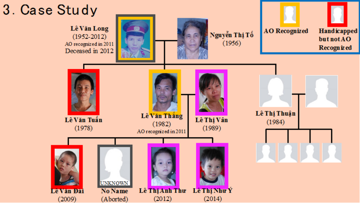 今回の発表で取り上げた家庭は、第一世代の父親が枯葉剤被害者に認定されたものの既に亡くなっており、第一世代の母親と、第二世代である長男(知的障害者)、次男(枯葉剤被害者に認定)とその妻、第三世代である3名の子どもたちの、合計7名の三世代家族です。第二世代の長男と次男は思うように働くことができないため、一家の収入は受給している助成金以外にはほとんどありません。そのため、若くて健常である第二世代の次男の妻が、全ての家事と介護、育児を担うだけでなく、農作業も一手に引き受けることで一家を支えています。