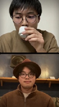 「さけまめライブ」で、外郎と日本酒を合わせている、写真上畠本編集長と下あっきー記者。
