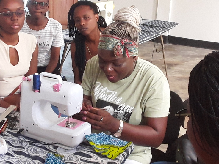 午前の部は前日に引き続きミシン初心者グループだったので、グループで一つのエコバッグを完成させることを目指して、5人の参加者が順番にかわるがわるミシンで縫っていきました。が、慣れないミシンに残念ながら完成には至らず、今週金曜日にもう1回追加することになりました。