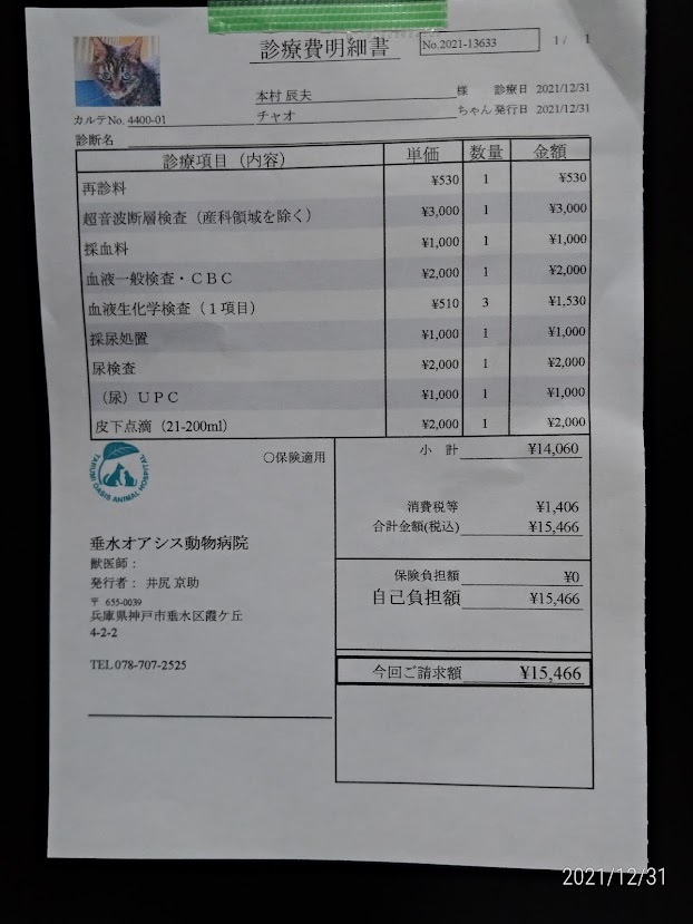 幸いなことにこの薬を出してもらった病院は31日の午前中まで開いており、朝一で血液検査と補液をしてもらおうと出かけました。