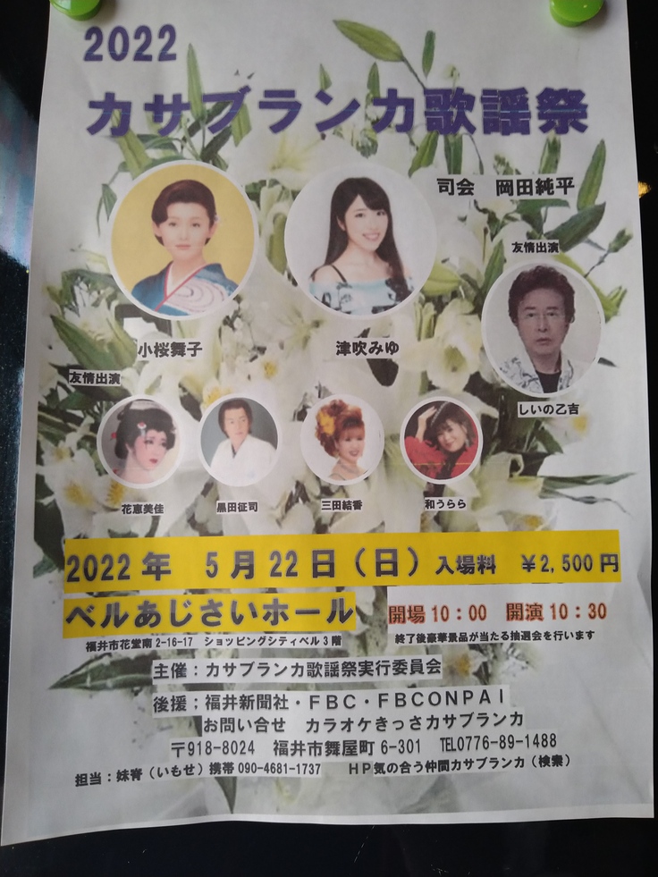 今回のイベント内容は、カサブランカのお客様80名による歌唱、そしてゲスト歌手による歌謡祭を開催します。見ていただいた最後には抽選会もありますので最後までお楽しみいただける内容になっております。