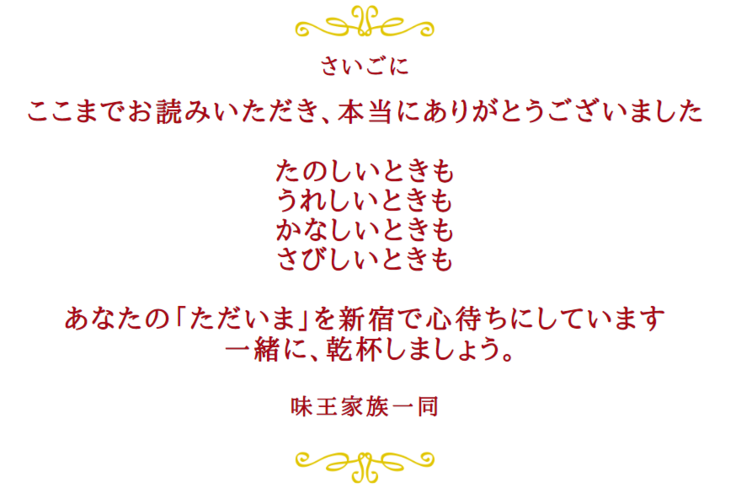 「常連さん、お客さん、味王の家族はみんな元気にやってますよ!」