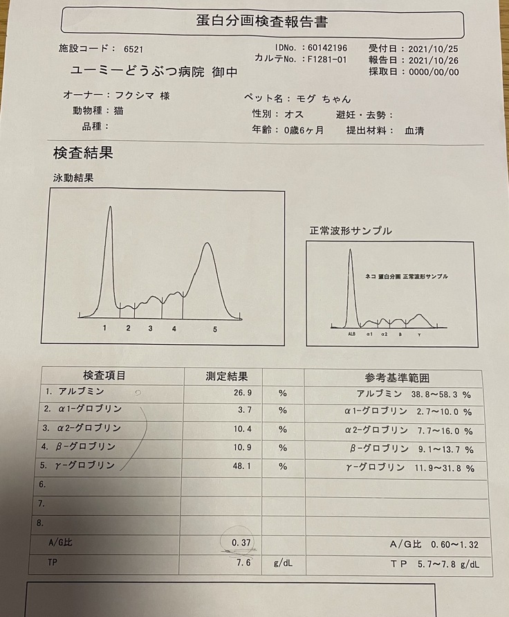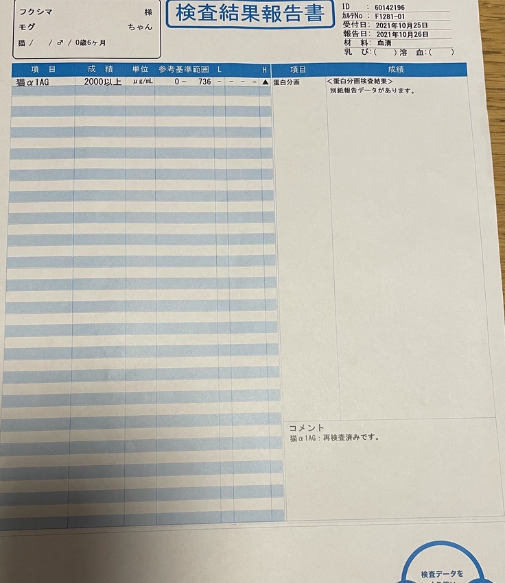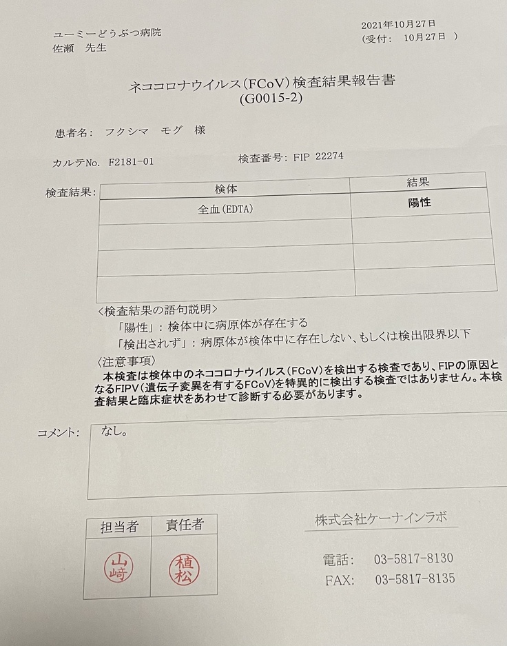 FIP(猫伝染性腹膜炎)は症状が出てから死に至るまでが早いので、早く来てくれてよかったと言われました。