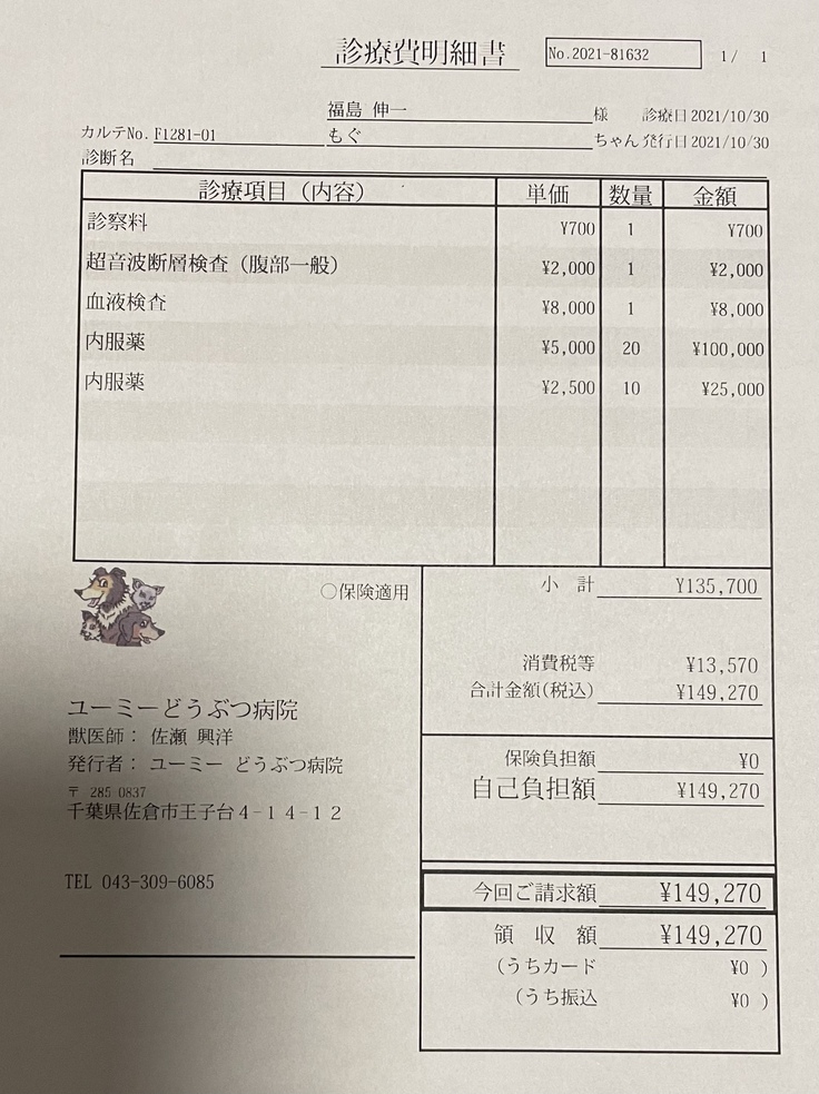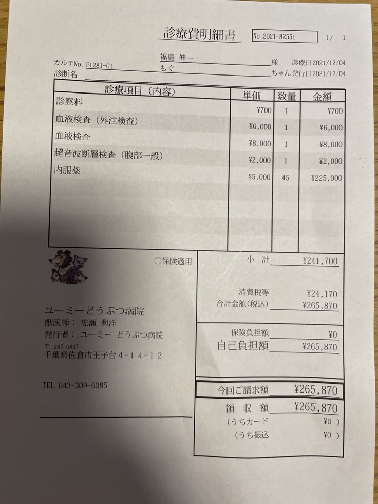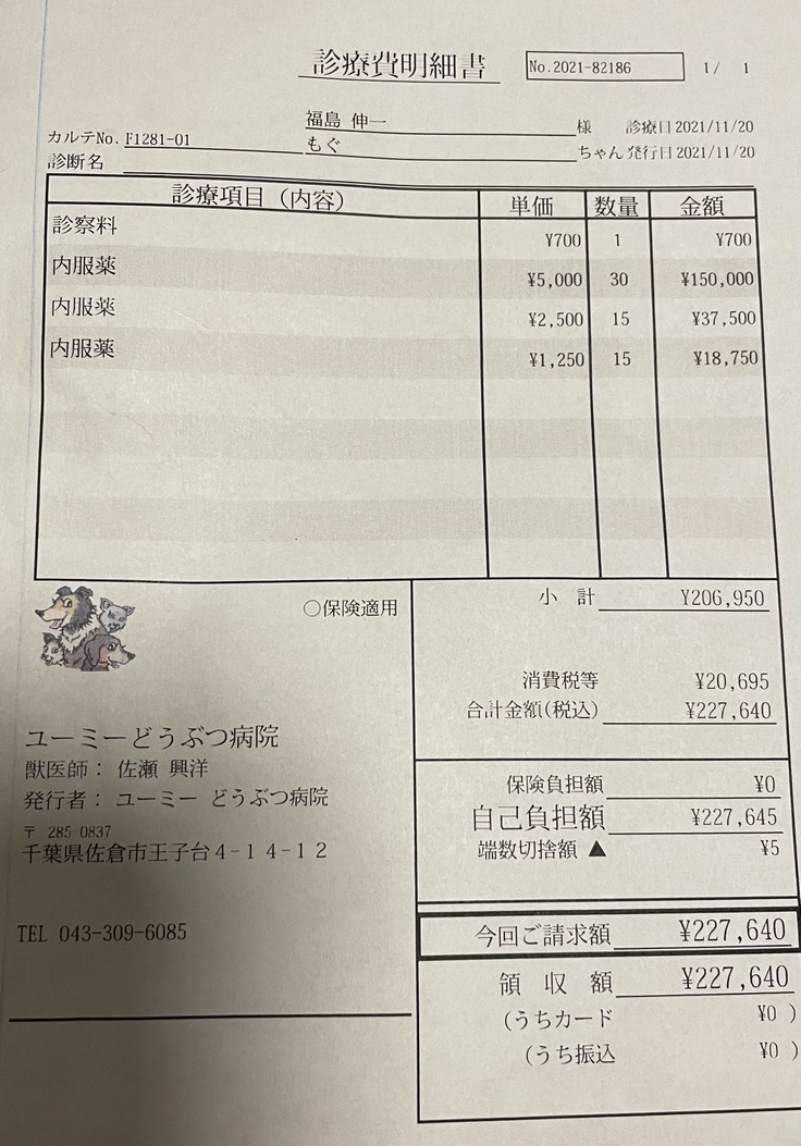 もぐの寛解(投薬終了)までに最低約¥1,338,250が必要となります。
