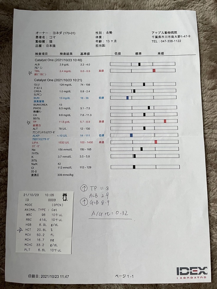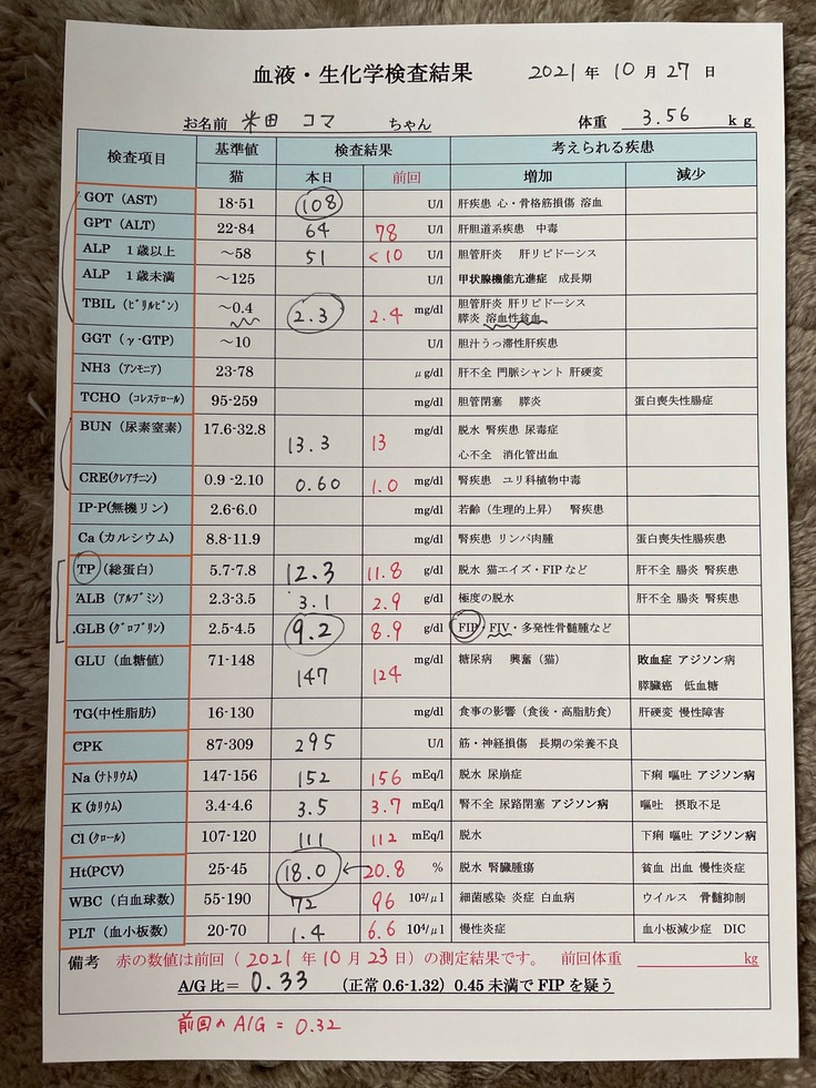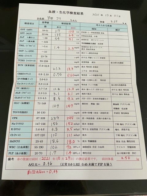 この時の体温は38.9度と平熱(猫の平均は38度~39度)でしたが、他の項目が異常数値の為、早急に猫伝染性腹膜炎(FIP)の治療ができる病院への診察を勧められました。