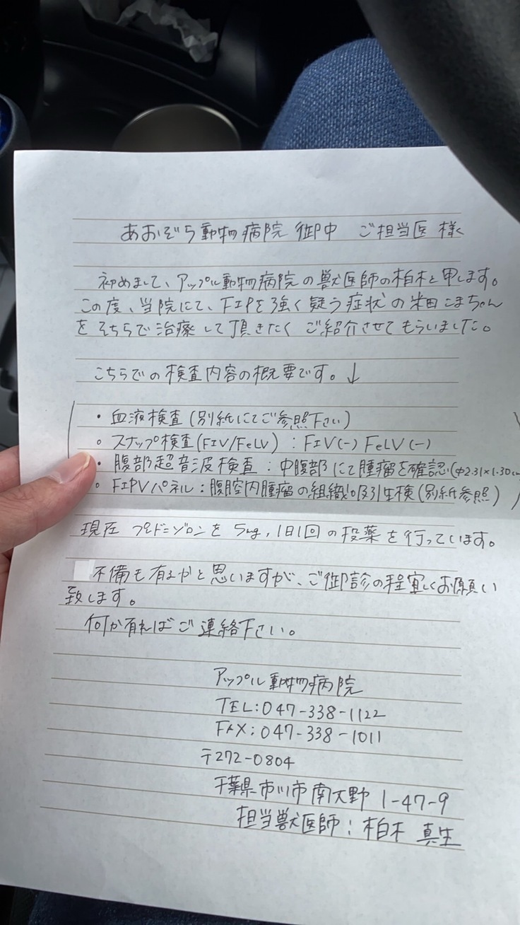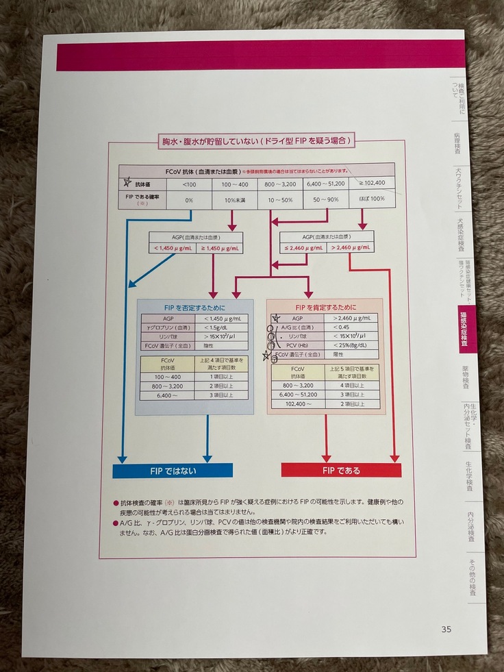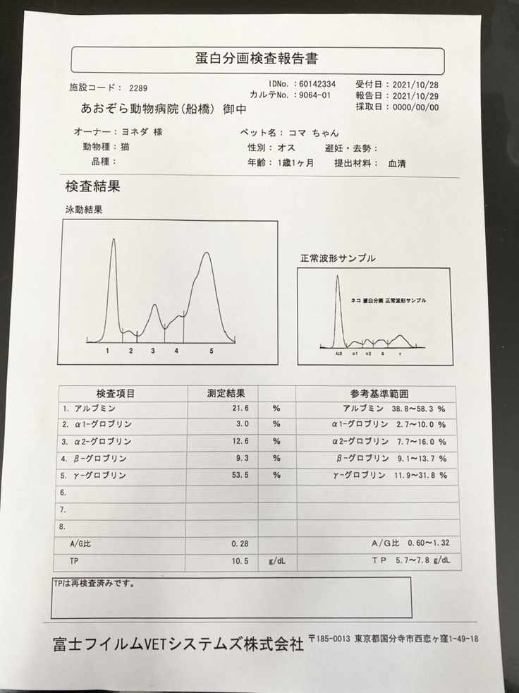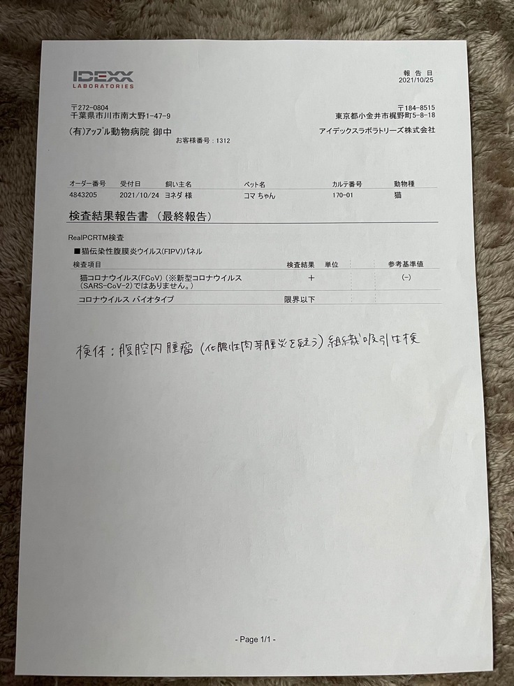 また腹腔内痬瘤の検体が検出され、猫伝染性腹膜炎(FIP)である可能性が高いと診断されました。