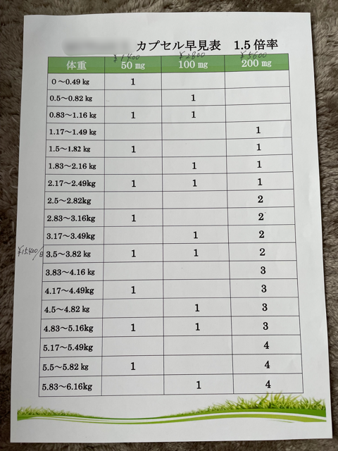 現在のこまの体重3.74kgの為、1日の投与は550mgとなります。