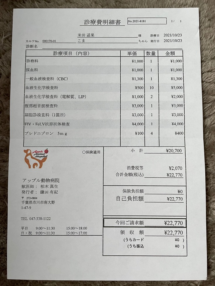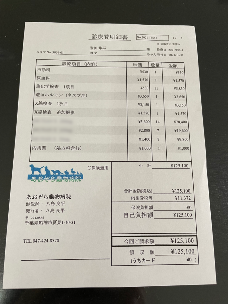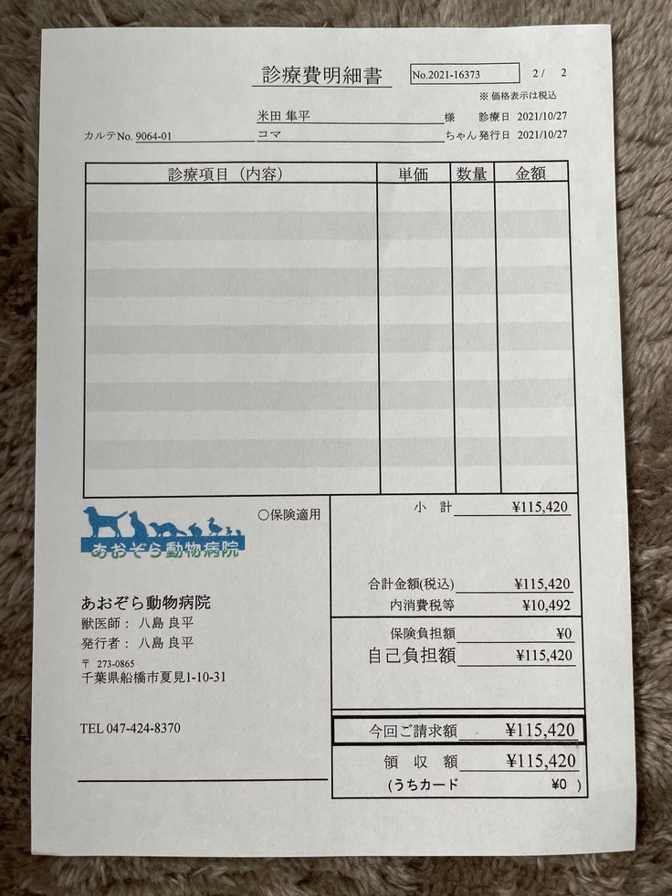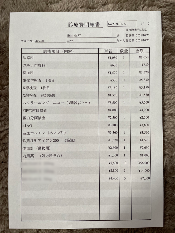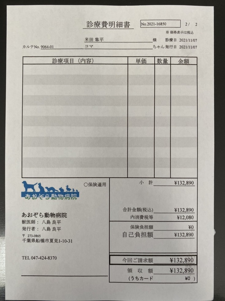 即決できる金額でなはないですが、私たち夫婦にとってこまは子供であり、家族であるため、こまの命を救いたい気持ちが強く治療を決意致しました。