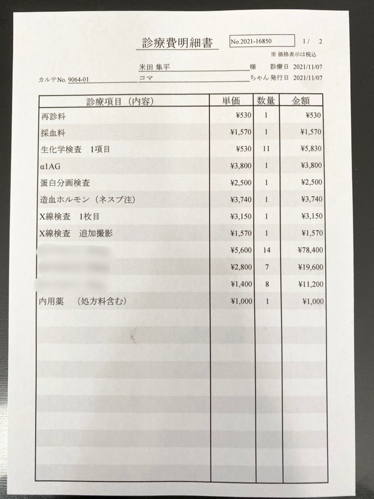 別途検査代=約300,000円(血液検査、外部委託の血液検査、レントゲンなど)