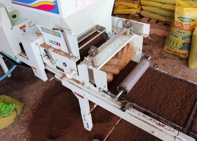 ↑浸種(しんしゅ)が完了した種籾は、ゴザやムシロに広げて、8時間程度、風で乾燥させます。翌日、土入れが完了した育苗箱に、種籾をまいていきます。田植機の植え付け爪が均質に掻き取ることができるように、均質にまくことが大切です。