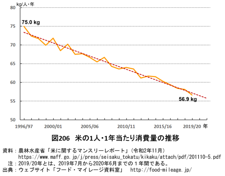 これが、2017年の記録ですが2000年に比べて圧倒的に人口(農業就業者)が減っています。高齢化に伴い農業において若い人が就業しなくなっています。それに続いて最近だとコロナウイルスや若年齢者も外食出来ず米の消費率も減少している傾向にあります。その為米が日本ではたくさん余ってしまって値段も下がって来ています。