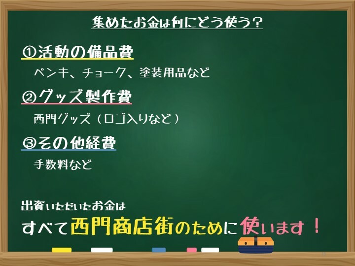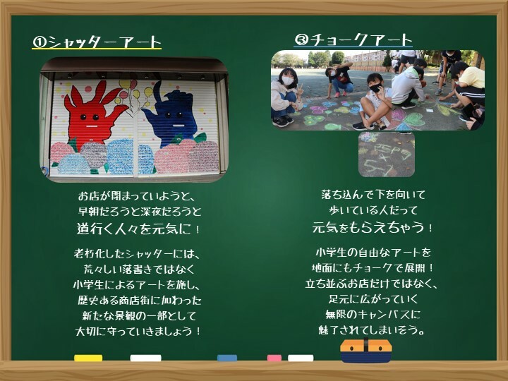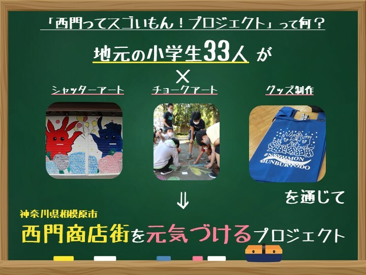 相模原市立富士見小学校5年1組で西門商店街を自分たちの手でアートします! 【内訳】 ①シャッターアートに向けて、塗料及び塗装用品の購入等 ②チョークアートに向けて、チョークの購入等 ③グッズ製作に向けて、製作費 ④その他手数料等