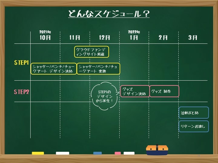 - 1.2月にかけてのアートの完成をもって、ご支援のお礼のメッセージや活動報告書等を作成し送らせていただきます。