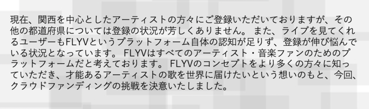 FLYVのコンセプトを多くのインディーズアーティストに知っていただき、また、FLYVの存在を多くの音楽ファンへ知っていただきたいと思います。「FLYV周知のための広告費および動画制作費のご支援」をお願いしたいです。