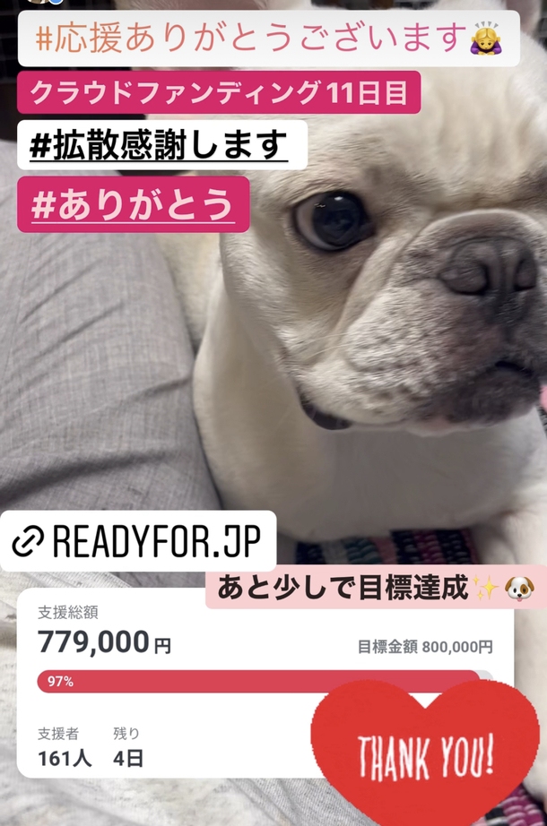 目標の97%まで達成する事ができ、皆さまの応援、そしてぽんじへの想いにスマホを見ながら泣いて帰りの電車に乗ってました😢