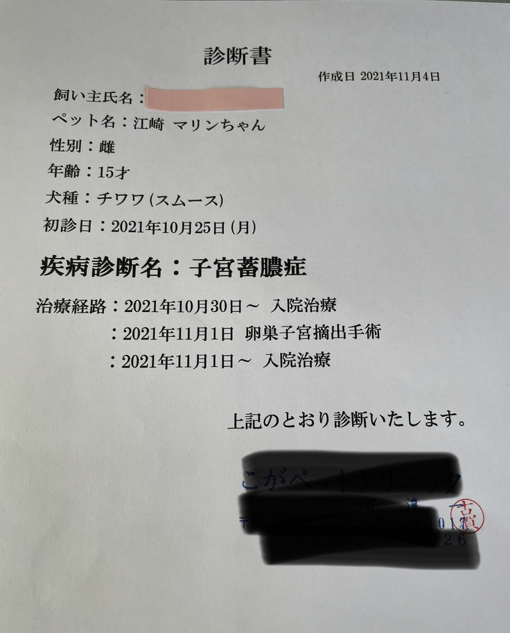 早急に手術が必要との事で 血液検査をして 10月30日から入院、 その後点滴治療をして 11月1日に無事手術が終わりました。 しばらく入院をして 術後の経過を見るそうです。 今は順調に回復へ向かっていると 獣医さんから説明がありました。 今回支援頂いた資金は、 マリンちゃんの子宮蓄膿症の手術、入院、術後の治療費に充てさせて頂きます。