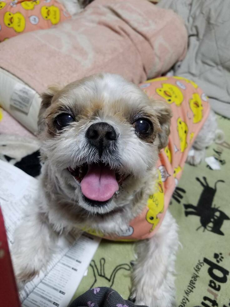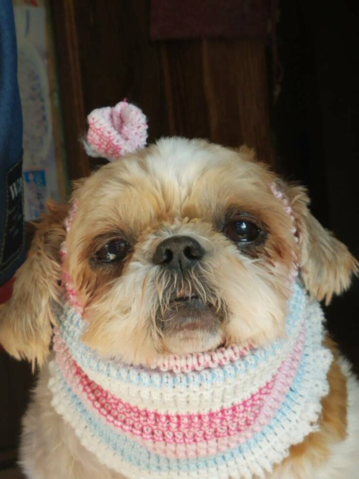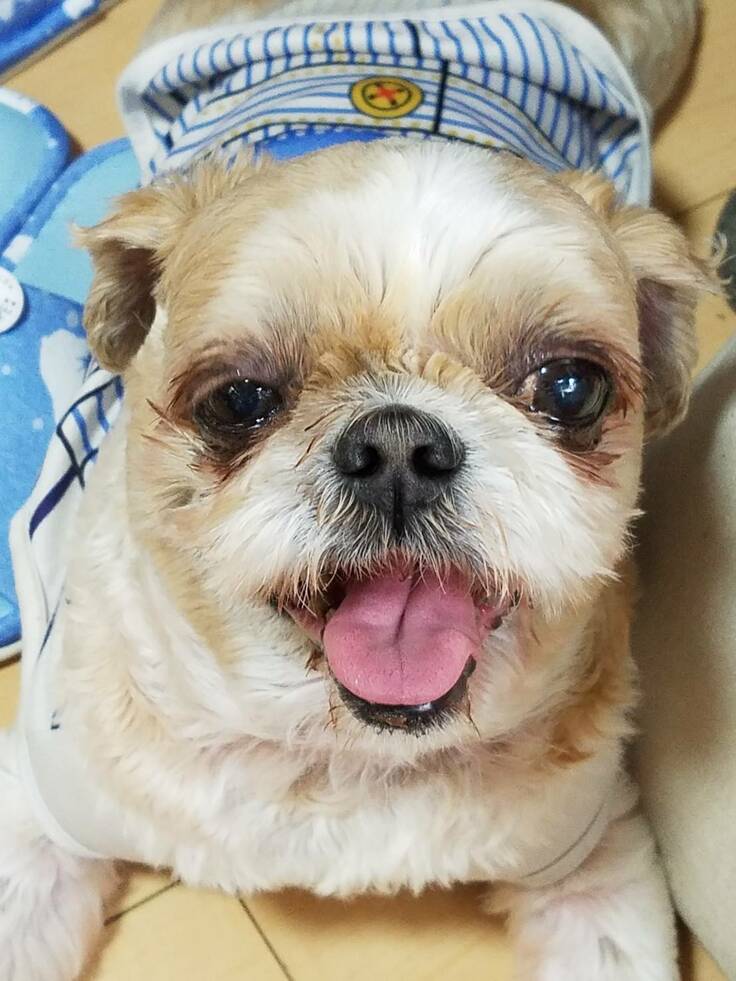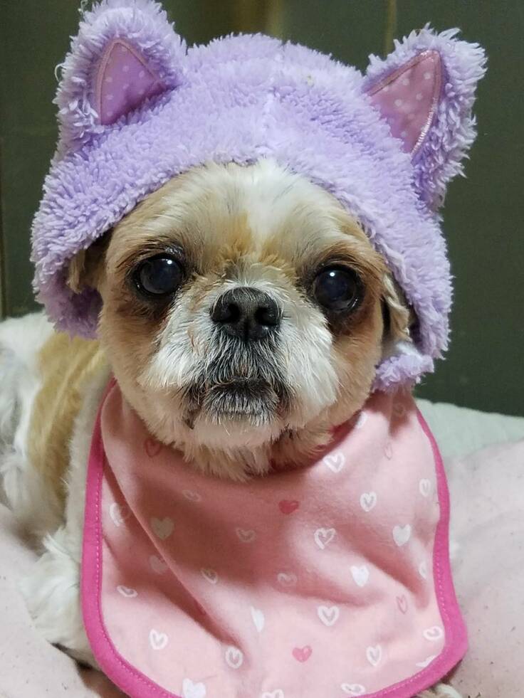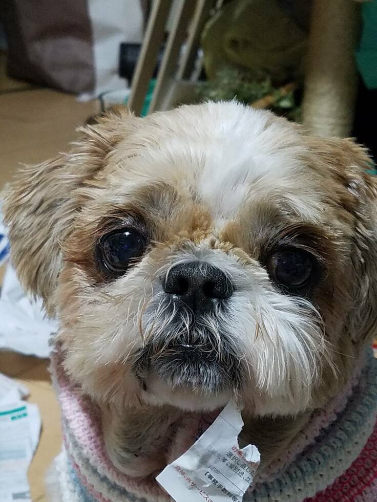 茶色と白のシーズーの女の子、現在12才。お目々がくりくりで、とても愛嬌のあるお顔がチャームポイントです。
