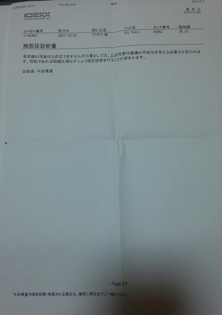 肺腫瘍と断脚した脚、頬の検査結果です。頬は特に心配はいらないとのことでしたが、肺腫瘍と骨肉腫については以前罹った扁平上皮癌からの転移が疑われるとのことでした。