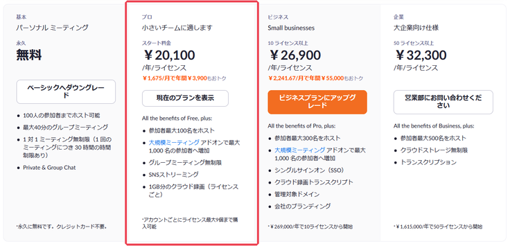 zoomのミーティングプランは“プロプラン”を選択します。