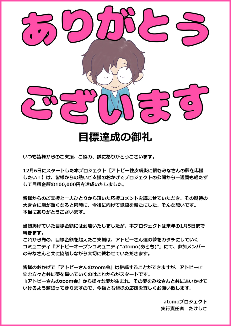 ご覧いただきありがとうございます。“アトピーさんのzoom会”を運営する『アトピーオープンコミュニティ“atomo(あとも)”』管理人のたけしこと申します。