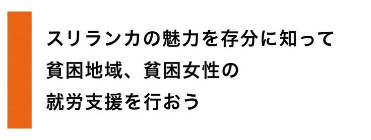 皆様こんにちは、初めまして。私はスリランカ復興支援に関連したプロジェクトを立ち上げて、雇用復興や女性自立に向けての支援などの活動を個人で行なっています。