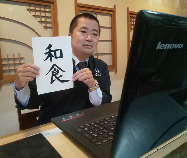 地域貢献の一環として6年前より小学校で、和食と出汁の授業を行っています。毎年学校に伺い、出汁の取り方等を教えていますが、今年はコロナ禍ということもありオンラインで授業を行いました。下の写真はその時の風景です。