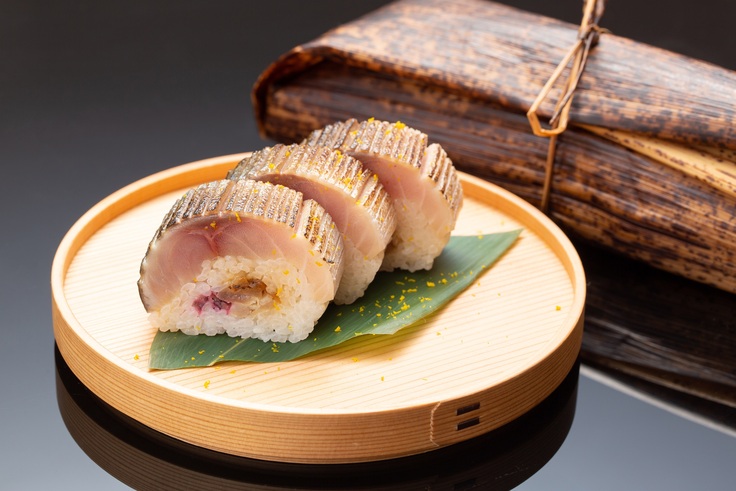 脂ののったサバは表面を炙ることで旨味を引き立て、特製の酢飯には椎茸と干ぴょうを炊いたアクセントある具材と共に、三大京つけものの一つであるしば漬を入れ込み、仕上げは振り柚子で香り良く仕上げました。